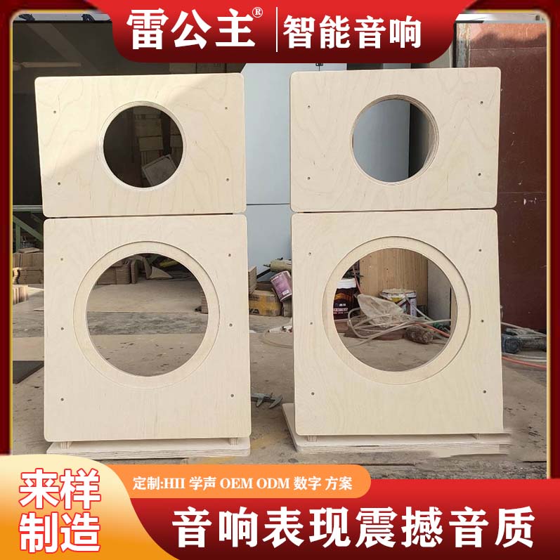 雷公主这款箱体的核心设计,是 **「小单元孔 + 大单元孔」的分层布局 **:每套箱体由上下两块实木板块组成,上层预留小尺寸圆形开孔(适配高音 / 中音单元),下层则是大尺寸圆形开孔(适配低音单元),既保证了不同频段单元的独立安装空间,也让声波扩散更有序。